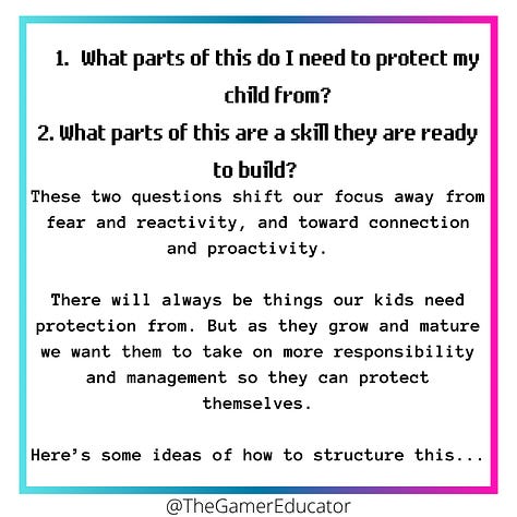 🚦Most importantly, protection and skill building aren’t mutually exclusive. Don’t miss the last slide with comparisons between the two; we might block chat capabilities with strangers in an online app AND allow our kids to play multiplayer games with friends they know in real life, so they are both protected and learning the skill of appropriate online interactions.